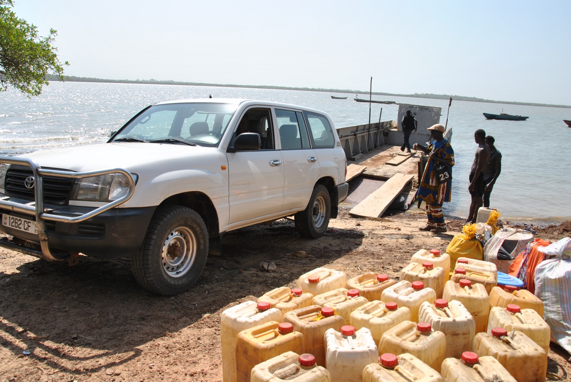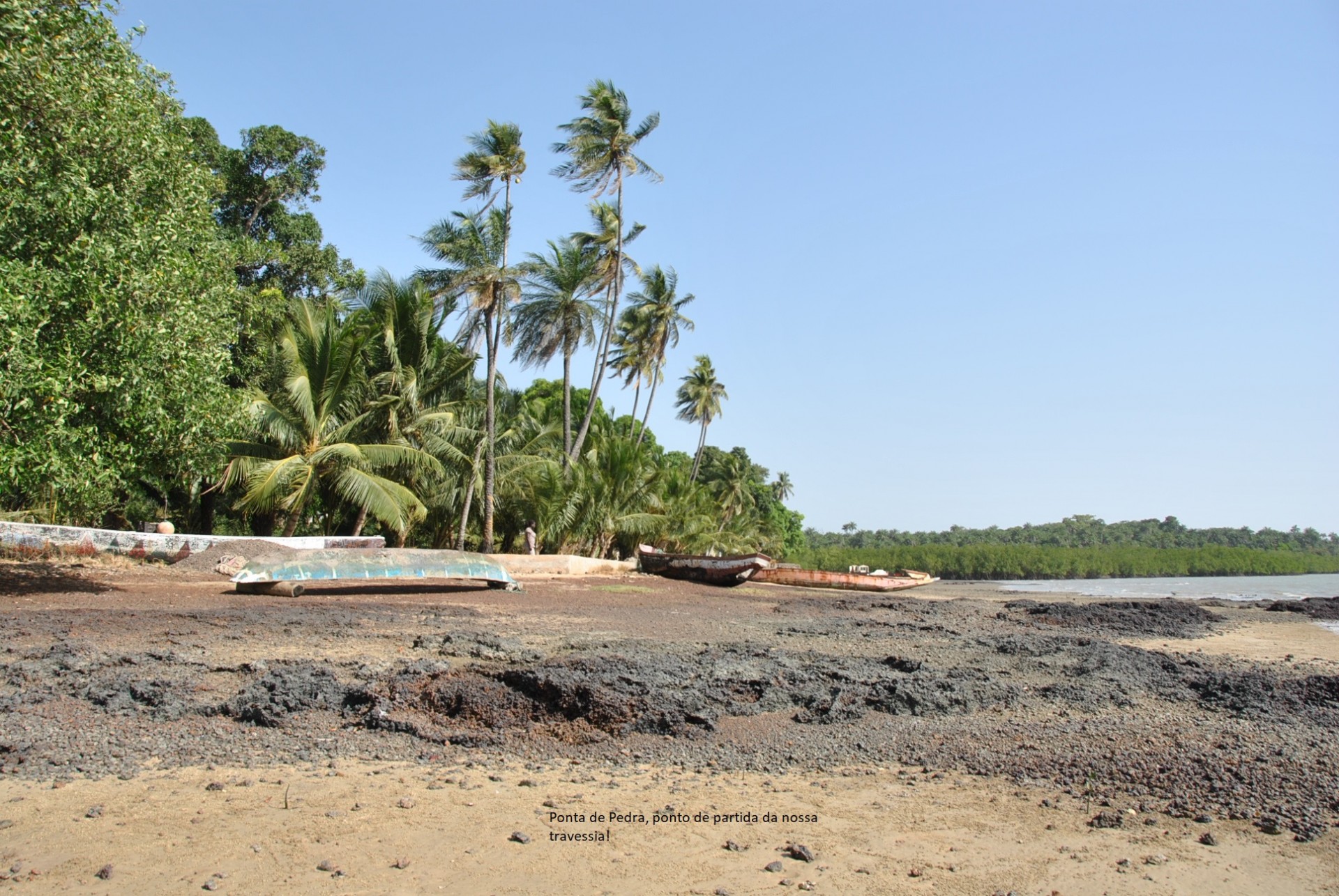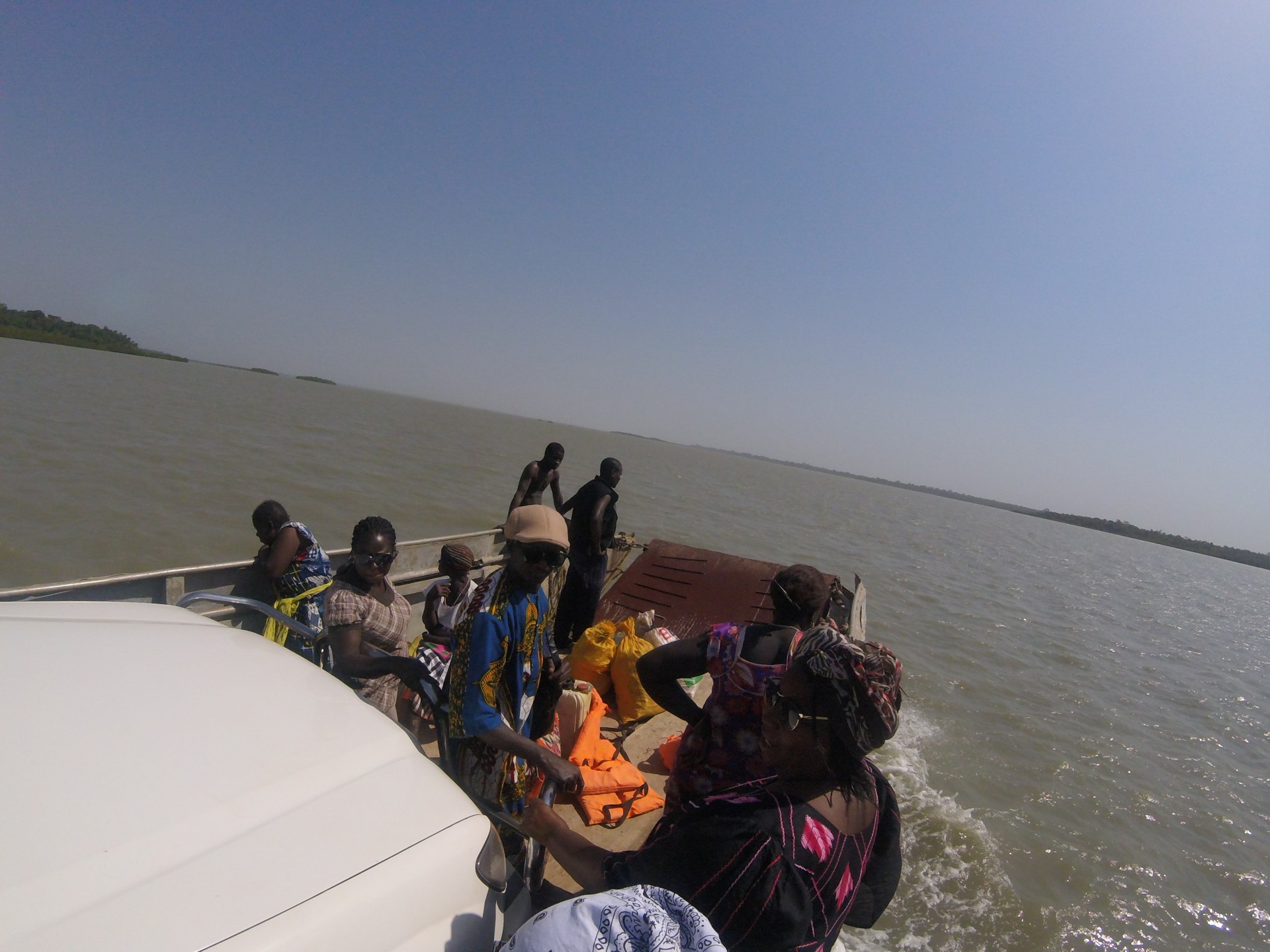 São 10h30 da manhã, chegamos a Ponta de Pedra, uma vila junto a foz do rio Mansoa com vista para o nosso destino. Quando chegamos a maré estava a subir, ainda não estava no nível ideal para atravessar, fizemos um passeio a beira mar/rio, comentamos a nossa vontade de voltar a Ponta de Pedra quando o empreendimento turístico em construção abrir, duvidámos que a pequena jangada atracada fosse aquela que nos levaria a nós e ao carro a outra margem, até que o senhor Carlitos chega e diz que já podíamos embarcar, são 11h30 (mais coisa, menos coisa). A terceira tentativa o nosso motorista consegue colocar o carro dentro da jangada (vejam as fotos para perceber o porquê de 3 tentativas), o carro tinha de ficar o mais central possível.