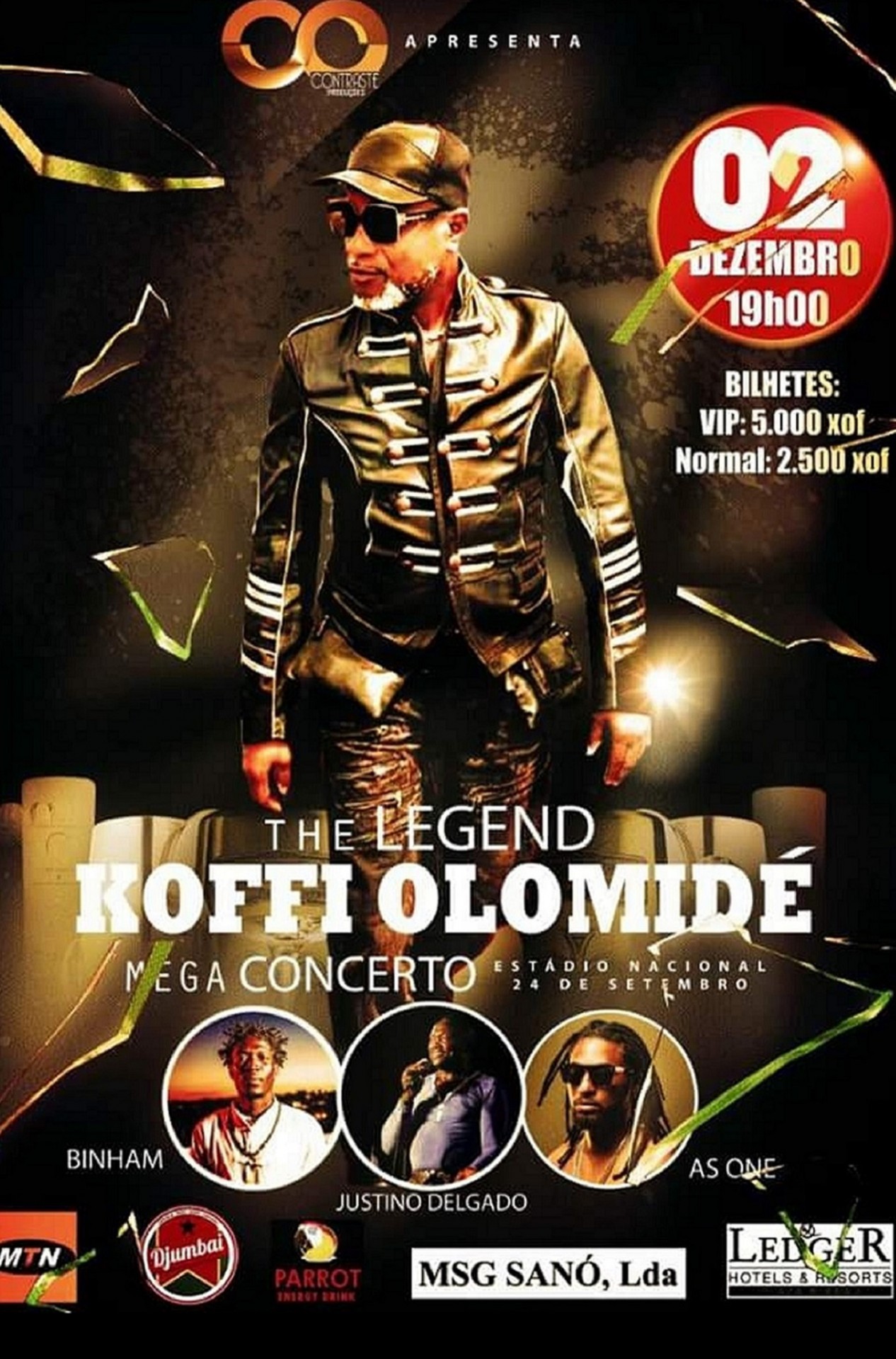 Concerto do músico congolês, Koffi Olomidé, no dia 2 de Dezembro às 19h00 na nossa capital. O concerto terá também a actuação dos músicos guineenses Justinho Delgado, Binham e As One. Os bilhetes variam entre 2500 xof e 5000xof